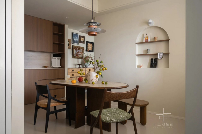 客厅空间融合多种材料肌理营造空间的独特性,优雅舒适感的家具、物件、艺术品,构成了丰富生动的生活场景。以柔和的奶油色作为主色调,营造出温暖、宁静的氛围;复古绿、焦糖色、深棕色等作为点缀,增添空间的层次与深度,同时呼应复古风格的韵味。