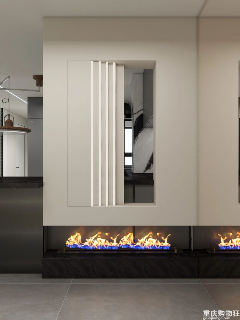 3/ 开放式厨房导致一入户就毫无遮挡的情况下做了一面入户装饰形象墙,镂空的设计加上线性灯光,让入户有层次感也不会产生拥堵的感受,鞋柜嵌入到墙体用灰色的镜面放大空间。