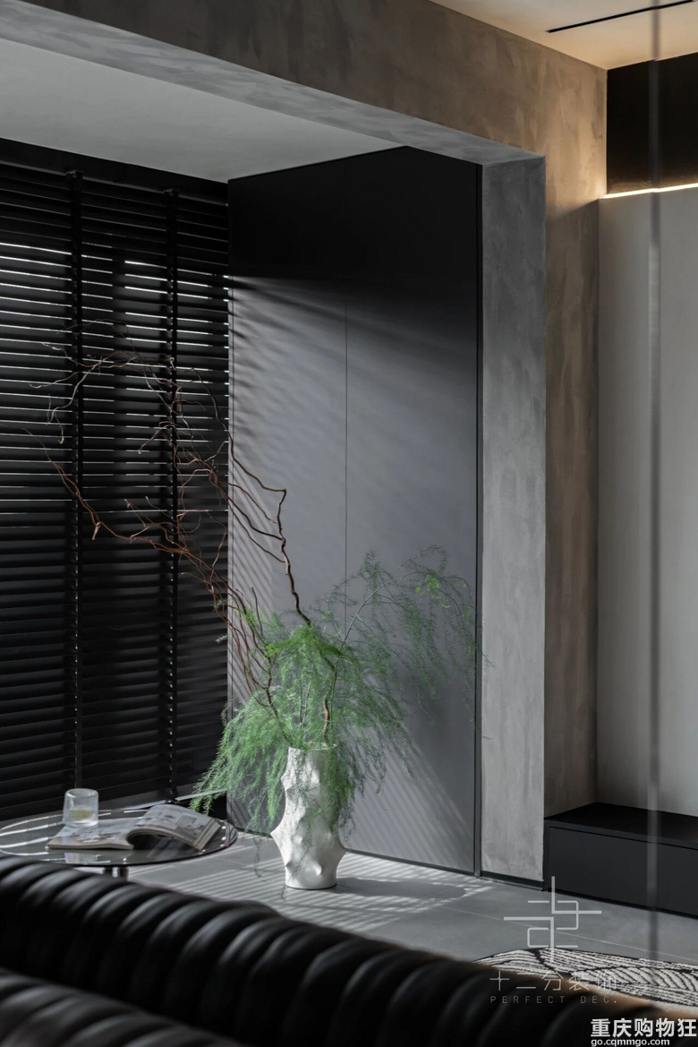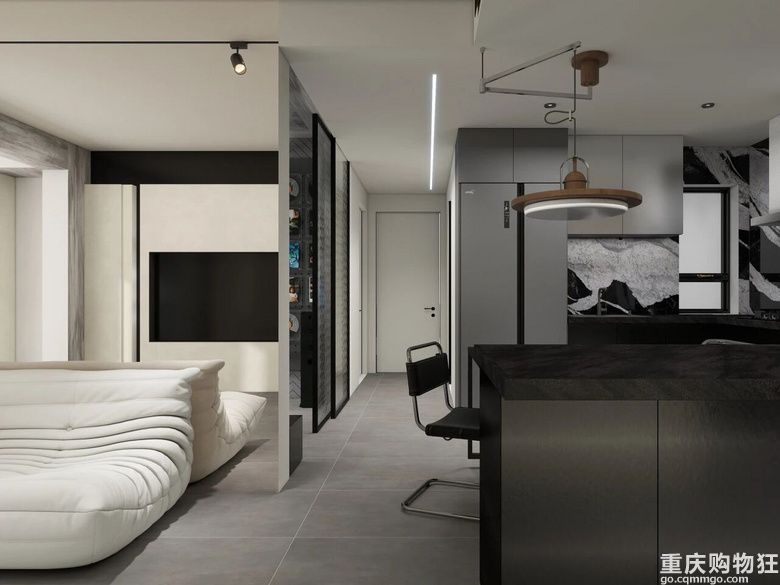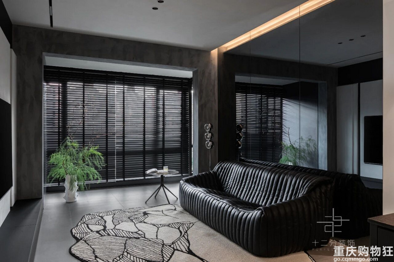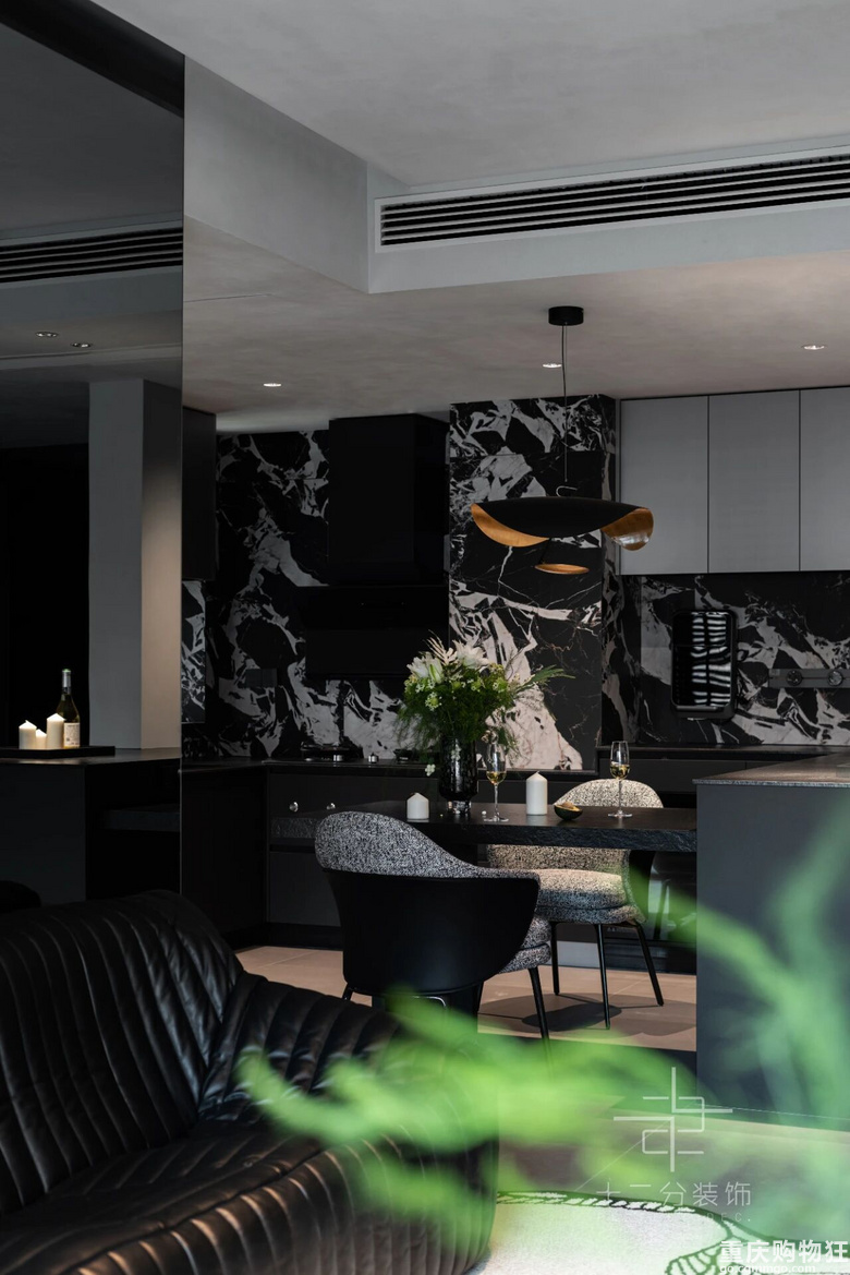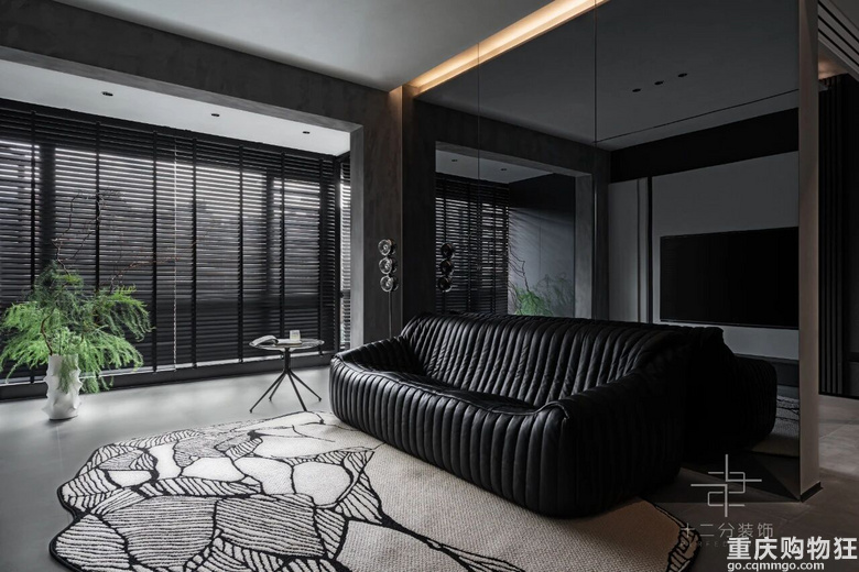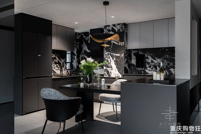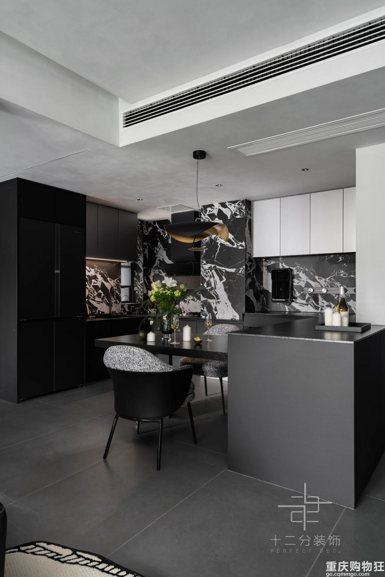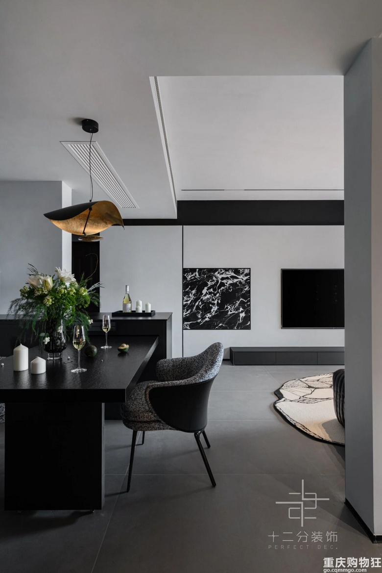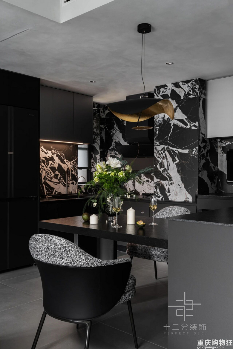 整体空间采用黑白灰现代风格,用宝格丽黑岩板做重点增加客餐厅厨房层次感,辅以全屋的肌理质感漆。采用大面积的灰镜扩大视觉空间,贯彻放大空间,凸出质感,线条感强整体设计思路。
