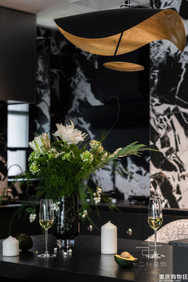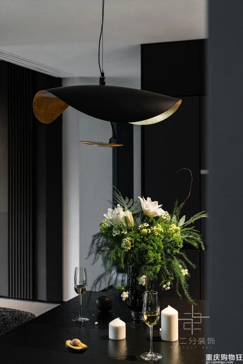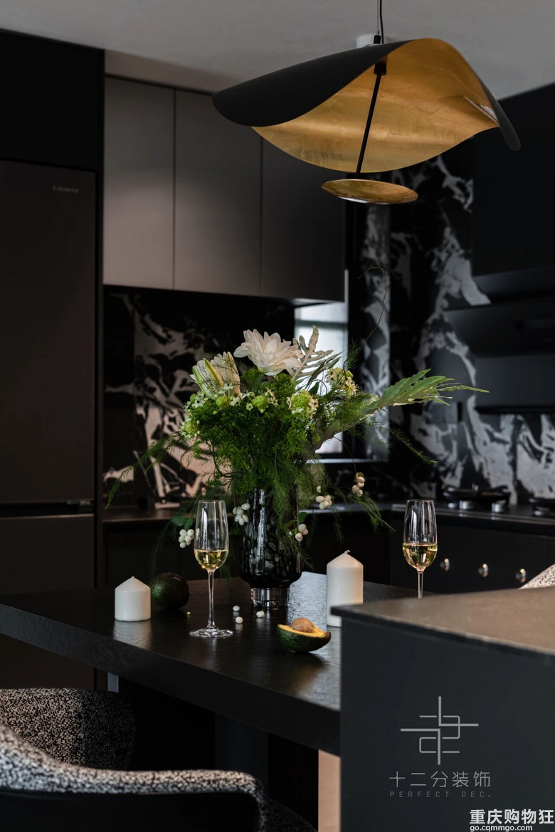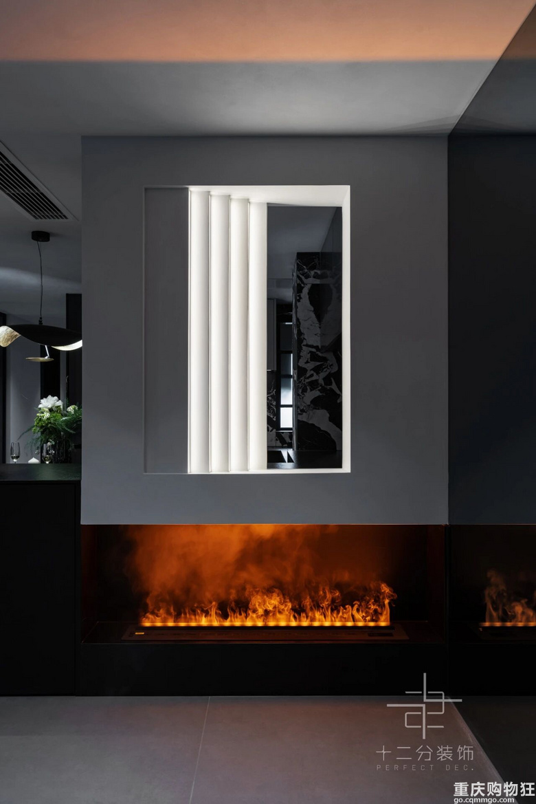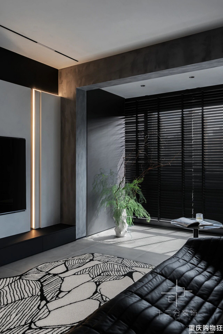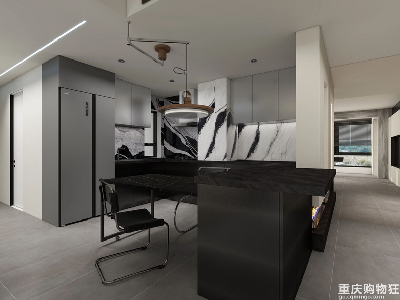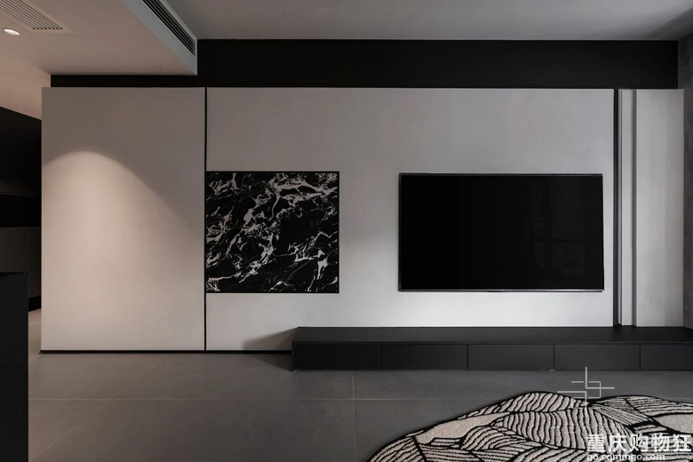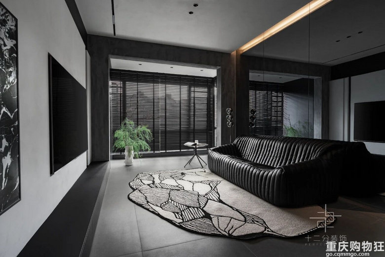 整体空间采用黑白灰现代风格,用宝格丽黑岩板做重点增加客餐厅厨房层次感,辅以全屋的肌理质感漆。采用大面积的灰镜扩大视觉空间,贯彻放大空间,凸出质感,线条感强整体设计思路。