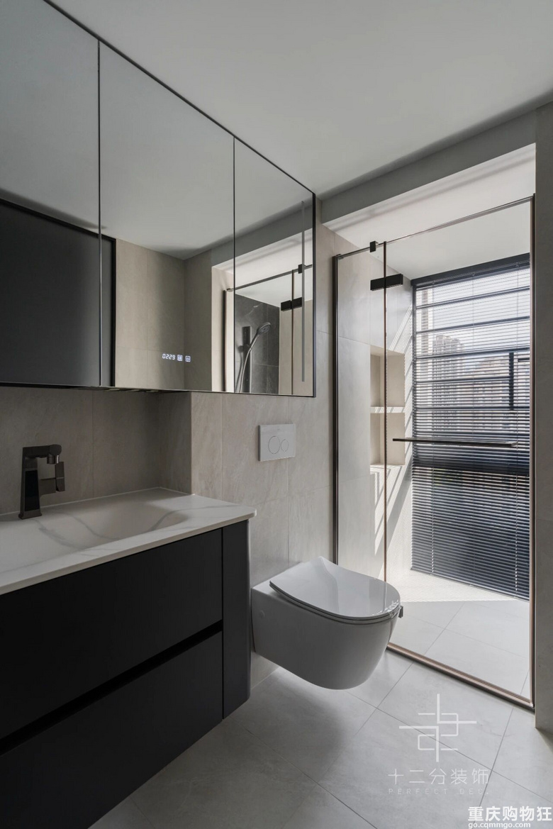 4/ 主卧推掉原本飘窗,把主卫门对门改成了斜面开门,在门后容纳一个一米衣柜。把次卫往客房推动了30公分,让次卫可以干湿分区,设备间和干区连贯起来容纳洗衣机烘干机,扫地机器人,锅炉以及洗漱一体盆。