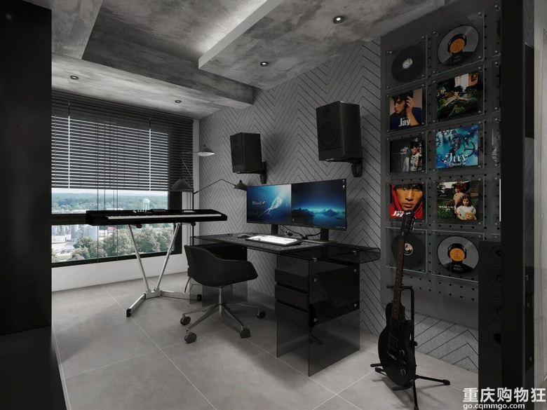 多功能房作为音乐创作室和电竞房,整体房间做了全面的造型吸音棉,顶上采取水泥漆,增加整个空间的工业感,营造出既冷峻又富有质感的氛围,后期会有乐器音响加入。而空间和空间之间是流通的,一边采用了折叠门,一边是联动门,需要聚会交流时全打开和客餐厅空间一体化。