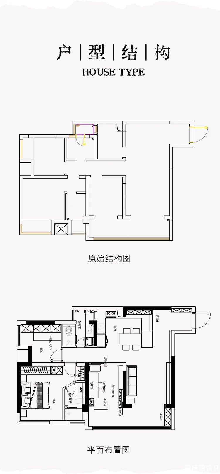 1/ 原始户型比较糟糕的是入户和厨房全黑,餐厅区域也很小难以满足聚餐需求,且没有生活阳台的位置,只有一个小小的设备间,连洗衣机都放不下去。
