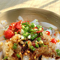 凉粉是一道很有名的小吃,色泽洁白,晶莹剔透,嫩滑爽口。有诗称赞:“冰镇刮条漏鱼穿,晶莹沁齿有余寒。味调浓淡随君意,只管凉来不管酸。” 凉粉种类繁多,用豆类、米类或山芋的淀粉等,加适量水稀释成糊,煮熟后冷凝成块,俗称“凉粉’。如豌豆粉、绿豆粉、山芋粉等,爽口清香味浓。