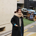 黑白条纹T恤+黑色紧身裤+黑色毛呢大衣+迷彩运动鞋+卡其色围巾+黑色毛线帽。
