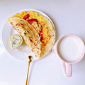 超市买的手抓饼,肉松,火腿,酱。不添加油的平底锅直接烙微波炉加热牛奶简易早餐就完成了