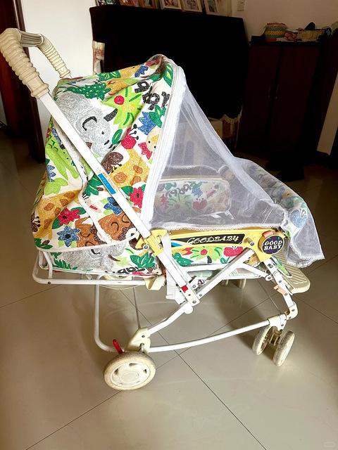 回老家居然翻出了30年前我的婴儿车! 婴儿车是好孩子牌的,30年前外公豪掷三百多大洋拿下送给我的百天礼物,30年后我儿子百天时又“继承”了这台豪车。 不得不说,国货之光好孩子婴儿车质量是真的好,30年前的设计,万向轮、刹车、减震、安全带、纱帐一个不少,甚至还是婴儿车+学步车二合一的,图案可爱,色彩明亮,车篮宽敞,比现在千篇一律的黑白灰婴儿车洋气多了! 时间在这台小车上发生了重叠,30年的时光