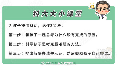 面对孩子求助,聪明的父母应该这样做~ 断然拒绝,会让孩子经历反复失败,以至于形成比较低的自我评价,遇事容易放弃。 来源 科大大科学家庭育儿