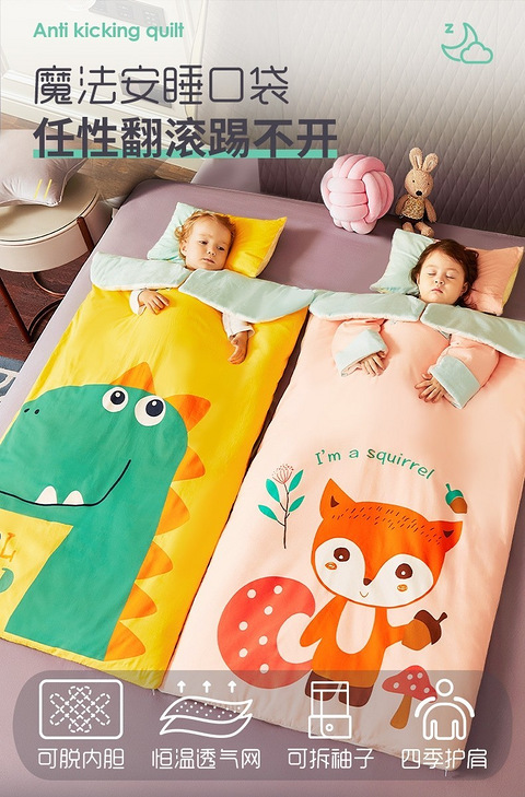 防踢被值不值得买?不值得。我这里说的防踢被,不是指睡袋,而是长得像被子,却像是被子升级版的产品,如在被子上多加个袖子,把被子和床单做个按扣等,真是汇集了民间智慧。说实话,这种被子乍一看没啥问题,想法也挺好的。实际使用过程中,问题就来了,孩子一翻身就容易把按扣弄脱了,再趴着睡,背后就空了,还是凉。要不就是翻个身,被子裹成了麻花,孩子不舒服。要大人半夜起来重新弄扣子,和每晚盖被 N 次差不多,孩子依旧