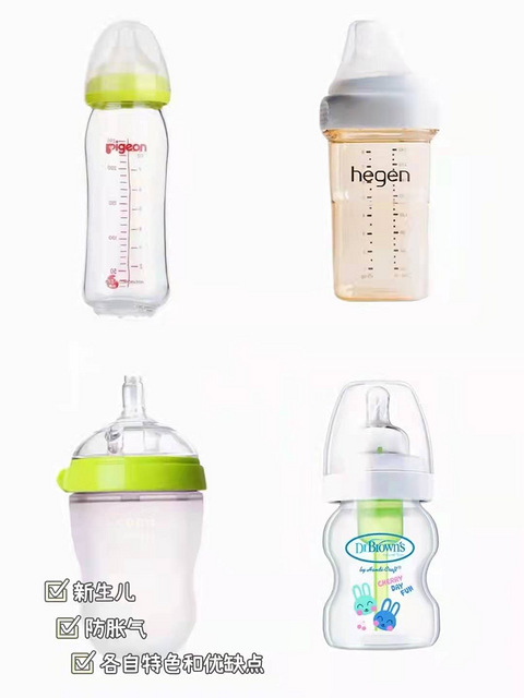 我来总结一下我们家宝贝用过的奶瓶,大家来参考参考吧~ 贝亲160ML宽口径玻璃奶瓶这个是我怀孕的时候囤的,身边大部分宝宝的第一个奶瓶好像都是这款优点性价比高,有ss号的奶嘴适合新生儿,这也是我当时怀孕囤货的主要原因,喂宝宝很顺手,还有一个很主观的原因一是玻璃的材质,让我觉得很安全缺点玻璃的很容易碎,比较重宝宝大一点自己拿奶瓶就不可以用了容易砸到自己 hegen奶瓶这款奶瓶我真的是因为它的颜值买的