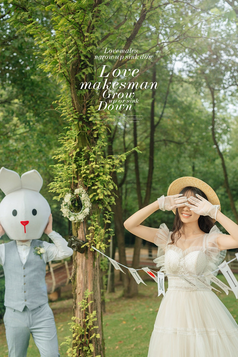 才拿到我的婚纱照,甚是满意,最喜欢这一套外景老公带的兔头,走得是可爱路线的森系风格~ 壹零贰肆 所谓的森系不是在森林里面去拍的,是在一个公园里面,一些很可爱的元素,玩偶头,还有我们的手捧花使用的满天星,真的超级爱这一束手捧花,拍完了之后我还拿回家保存起了