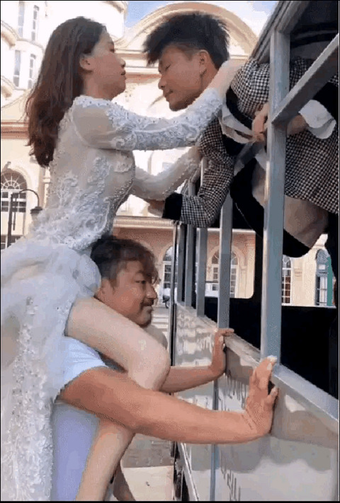 近日一对新人拍结婚照时,发生了一件搞笑的事情。这对准新娘新郎为了留住美好瞬间,选择了一个有点高难度的动作进行拍摄:就是新郎模拟从车里探头和新娘深情吻别的一幕,不知道是为了追求效果的完美还是剧情需要,拍摄现场没有用道具,而是摄影助理亲自上阵,叫新娘骑乘在他的脖子上,按照摄影师的要求调整机位拍摄,看到摄影助理那咬牙切齿的表情,真是太搞笑了。不过看最后的拍摄效果真是美极了!