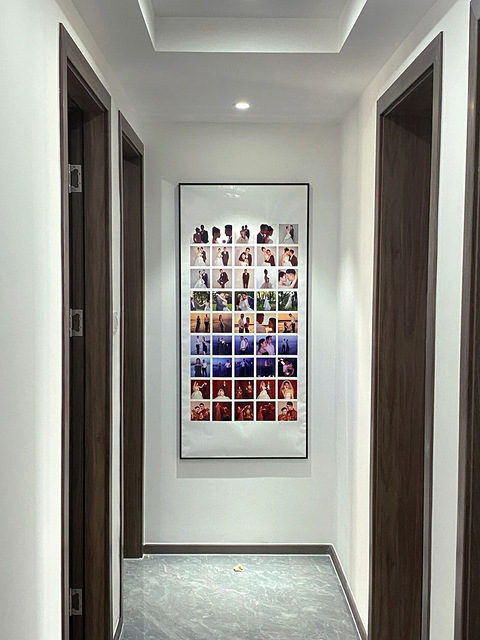 我这个是打印实体店里做的,框和画都是一起弄的。可以先到打印店咨询下把这个效果图给老板要求做同款样式,我的挂画尺寸是70×150不然也可以按照下面这个方法网上弄就是麻烦些1.确定墙的尺寸然后按照喜欢的比例大致确定画幅需要多大,长宽最好是定成10cm的倍数这样框好定制2.告诉设计师需要印的尺寸让他直接按照尺寸新建底稿,具体照片排版可以用我这个当范本3.找打印婚纱照的店,影楼专用高品质相纸打印?4.我