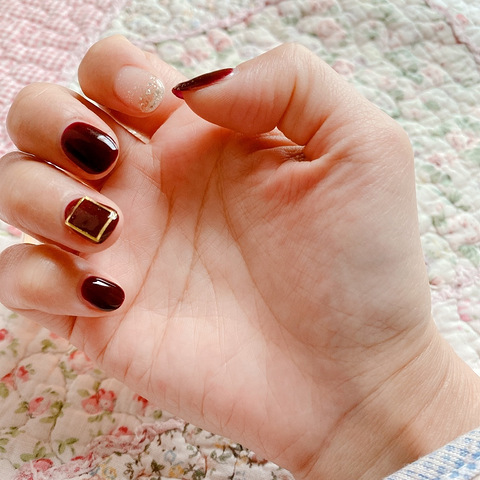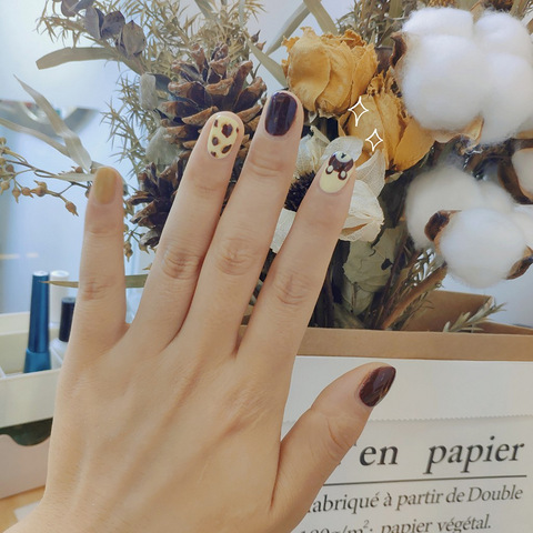 因为手太大了,很不女性化,经常被吐槽我的手很像男性的手,指甲油我都只敢自己涂了欣赏一下又擦掉,长这么大从来没有做过指甲。看到心选上有团购,被朋友怂恿起就尝试了一下,去做了个适合秋天的美甲。就做个指甲,整整做了70分钟!全程不能玩手机,这就是当女生的快乐吗???第一次做美甲,也不知道啥好看,网上找了个款式给美甲师照着做,本来是四个素色一个花色。美甲师觉得太单调了,又给我设计了一个小熊,可爱到犯规啦这