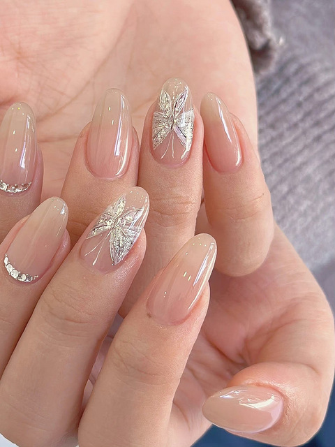 真的太美了,以前怎么没觉得裸色美甲这么好看,这么欲呀 银色蝴蝶图案,还有点仙仙的