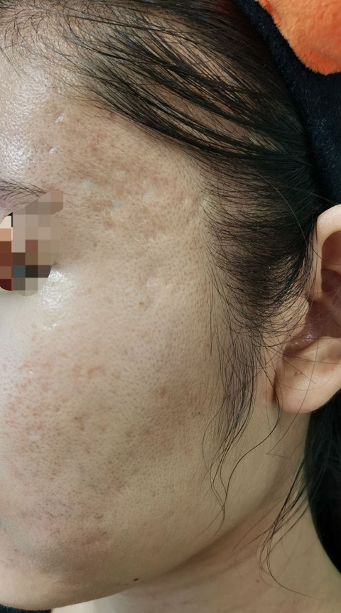 做之前的照片,痘坑大而且很明显,忽略我油腻的头发。。。太阳穴,脸颊都有,还是挺多的
