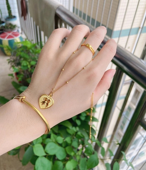 包包买得差不多了,决定今年再不买了,但是岁数大了又喜欢上了黄金。过年想买个金镯子。先去的周大福,试了传承,54号我戴大了,一甩手就能掉出来感觉。52号要订,又不想等。后来去了隔壁的六福,他家54号要比周大福尺码小,我戴上勉强可以,松是松了点,但不掉。后来又加了一条双圈手链叠带,也是比较松,也懒得拆珠子了就这样吧!戒指是我自己diy的,我8号特别细又不喜欢活口,所以超难买!这也是七拼八凑搞出来的。五
