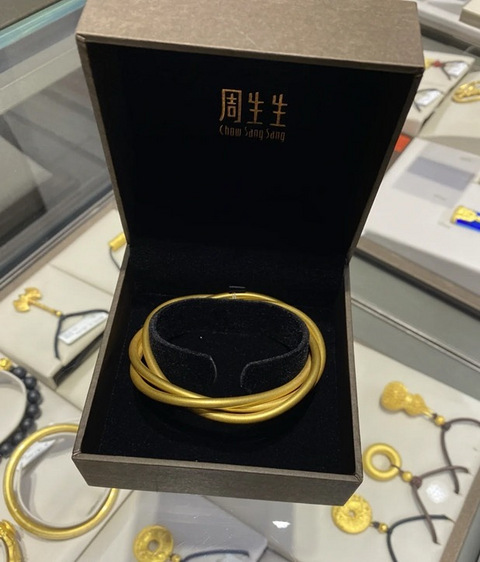 周生生三生三世黄金手镯柜姐说这款足金手镯灵感来自清代宫廷藏品呀(绞丝玉雕活环手镯),三个互相缠绕,寓意三生三世,不离不弃。寓意是真的好