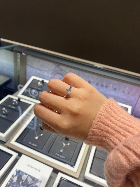 跟男朋友在备婚啦,最近在选戒指~我发现我手短胖短胖的,戴这种圆圆造型的可爱,又不喜欢太繁琐,去周大福试了这个守护一生系列,大小是50分,颜色I-J,净度VVS,标价是31500,柜姐说给我85折,算下来27000左右,不是很懂行情,就是觉得自己适合这个形状的,有没有懂行的小伙伴呀~