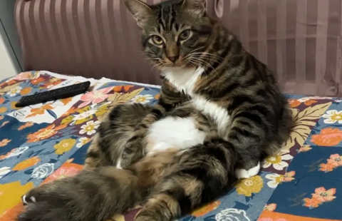 过年的时候救助的流浪猫,现在十个月了,有时候舔着舔着毛就会保持这个动作好久,想问下宝子们这样是正常的吗?(他的父母都是普通狸花猫