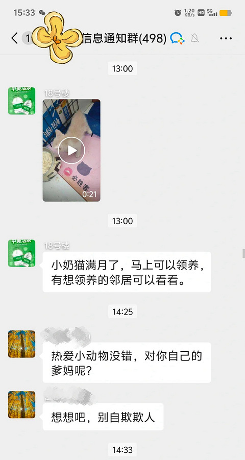 事情的起因就是如图一所示【18号楼】这个邻居在群里发了小奶猫领养的消息然后【黄色森林头像】这位不知道是大叔还是大妈就应激了追着人家咬…...中间说自己心里不痛快最后可能是没面子了说是介意狗随地便便 but!【黄色森林头像】这位他不在这个楼上住!!!!!! 后续多多,超级精彩 转自xhs@春眠不觉晓女士