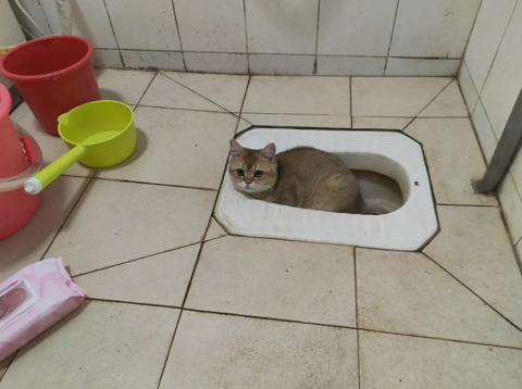 它又跑到蹲坑里面去了!