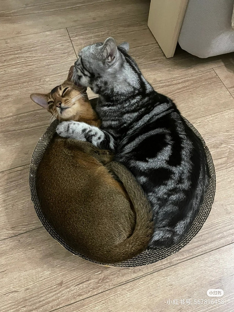 两只猫在一起久了,躺着坐着窝着,姿势都会变得一样