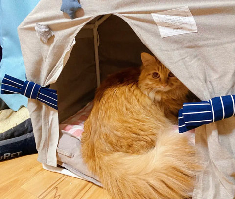 把新的猫窝搭起来了,橘公主表示很满意立马钻了进去