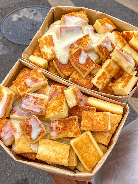 9敏我在重庆找到哦烤芝士条!!不是烤年糕,就是超市很贵的那种烤芝士条!!他们家我打听了才28r,而且能打包带走(但是必须趁热吃)!!烤得焦黄焦黄的时候口感无敌棒!奶香奶香的还能拉丝!!!