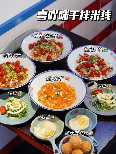 这应该是重庆首家干拌米线吧第一次吃到这么绝的米线,而且最近还能9块9随便吃在5.29-6.28这段时间,全场所有米线9块9,还能续的那种!还不快冲·店名:喜吖咪干拌米线地址:观音桥阳光世纪奥特莱斯2楼外围靠近红鼎国际B座·[泡椒鸭血米线]在重庆,泡椒鸭血米线是经常吃但是干拌的吃起完全不一样!泡椒与鸭血的碰撞,麻和辣的完美融合没有汤汁儿的米线吃起来也不会烫嘴!不愧为他们家的招牌·[蟹黄虾仁米线]这么
