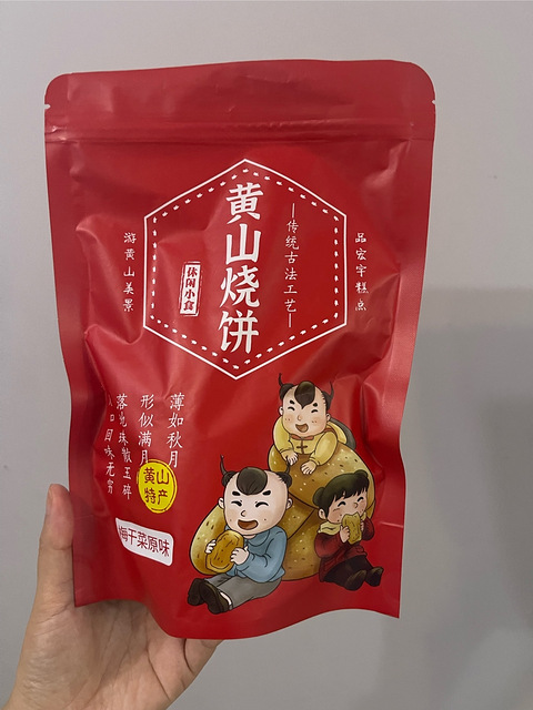 朋友国庆去黄山了带回来的零嘴,早有耳闻的黄山烧饼,好好吃,梅菜扣肉味的,表皮酥酥的