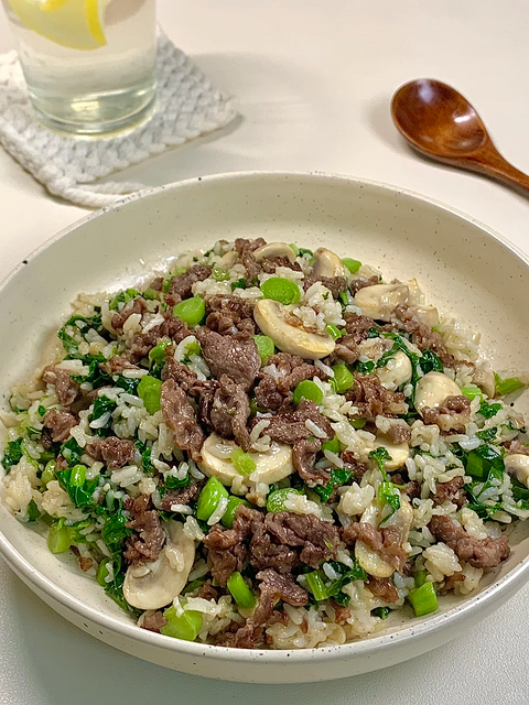 饮食想吃得比较干净的话,可以试试牛肉菜心炒饭!还加了点口蘑的,巨香,低卡低脂高蛋白~