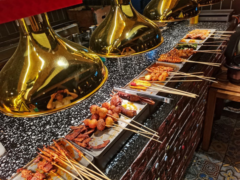 在美团上刷到了一家新开的炭火自助烧烤—小乙烧烤,位置在北滨路工商大学校区附近。这个价位我只试过自助的纸上烧烤,但是纸上烧烤哪有炭火来的好吃(?ω?)hiahiahia,所以就去试试。他家是开在酒吧里面的,烧烤自助不提供任何酒水,只能自费去拿,老板肯定是靠买酒水挣钱啦。自助形式是,店员在后厨烤好,放在长长的吧台上,顾客自助去取。不用自己动手烤,省事儿了。