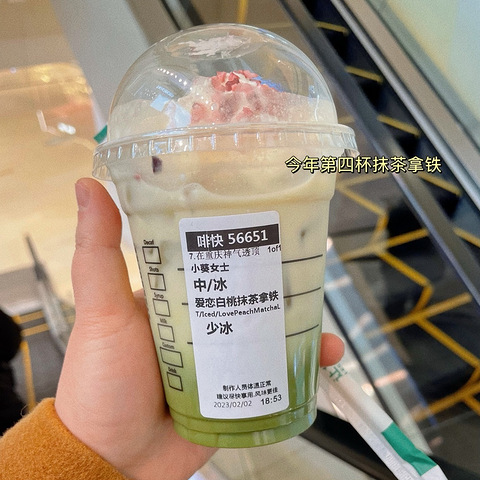 星爸爸勒个春节新品爱恋白桃抹茶拿铁好好喝哦,已经喝了四杯了