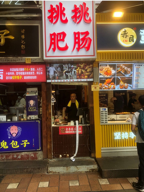 还是在论坛里看见介绍挑挑肥肠的,没有特意找过,深巷小吃挑挑卖,都说买到要看缘分,先排队,还有外地游客打卡。这次路过八一路好吃街,旁边施工,高高的脚手架上挂了很多美食宣传,其中就有“挑挑肥肠”,走到磁器街路口,看到两边各有一家门店。手机一搜,原来已经开了这么多线下实体店,不知道哪个正宗、好吃。
