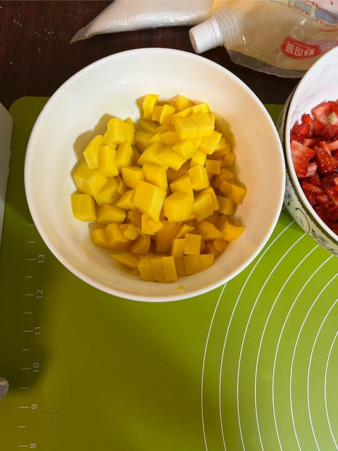 想了好久的雪媚娘……终于忍不住了,下班回来,吃完饭,整起做了两种口味……芒果和草莓,皮是自己调配的……没有买预拌粉……自己调配的要好吃一些,真材实料