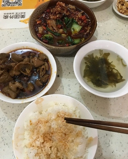 传说中的江渝不关门,终于找机会试了一下很好找,马家堡车站往杨家坪方向不到20米,不过门口可没有停车的地方,但好多出租车停在那里吃饭,交警也不管,这也是对餐饮行业的支持吗?首先必点的是水煮肉片,先要知道的是里面可以选择三种打底素菜,三选一哈,豆芽,瓢儿白,卷心白菜这次不知道,上的是一份瓢儿白,红色的肉片下面是翠绿的叶子菜,又好看,又解腻味道说实话不是很出彩,但很实在,该有的口味都有,不重不淡。当然有