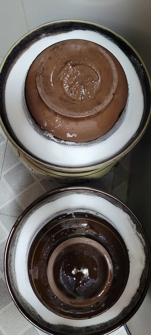 在坛边放一圈盐,加一点水。再也不用换坛边水了,水干了就再加一点水。盐水自动杀菌。