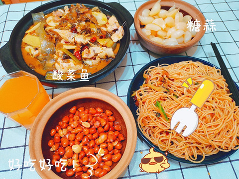 简简单单又一餐:酸菜鱼、糖蒜、花生、凉面。这个天气做饭全身汗水直流,真心热。[ej=1F625]