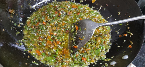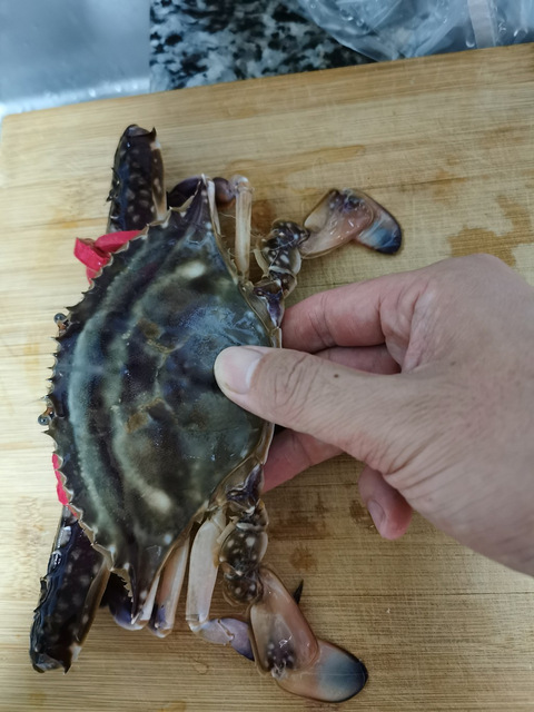 老板说要吃蟹蟹蟹蟹蟹蟹。好滴好滴下午下班,直接杀到双福,选了4个大蟹蟹,2斤。跟着我做,保证好吃。简单。 4个,够大得。。。刚好2斤。 自己杀,小刷子刷干净。杀多了也就熟能生巧啦。去掉不能吃得部分。砍成小坨坨,剪掉没肉的脚脚尖尖,大钳子用布包起敲碎。扑上生粉。准备开干! 热锅小宽油,葱姜爆香,炸出味,捞出不要。下蟹蟹,可以分成几次炸。炸好,捞出备用。 炸蟹蟹得油,滤网滤出来,放冰箱,炒菜菜香得很哦
