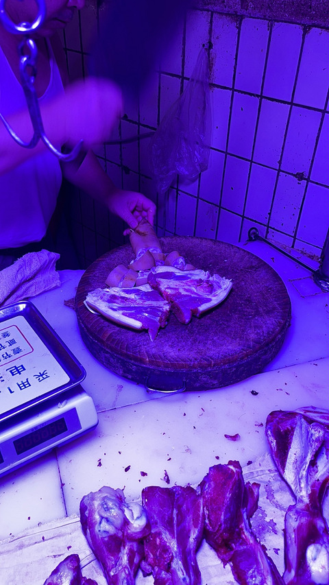 菜市场的肉摊灯光,拍出了恐怖片的效果