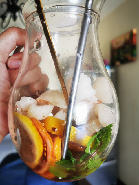 大热天给大家推荐一款解暑饮品—薄荷柠檬荔枝花茶自己腌制的柠檬蜜一点,加冰冻荔枝肉加新鲜薄荷叶加茉莉花茶水,清爽又解暑。