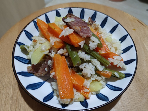 三杯鸡之大型翻车现场今天准备做个三杯鸡,没想到翻了个车,活生生做成了个黄焖鸡。材料:大蒜、小葱段、姜片、青椒、红椒、(本来是应该用红的肉椒,但是家里没有,只有将就了)米酒、冰糖、生抽、猪油,鸡腿。鸡腿先去骨,把锅烧热,不放油,把鸡皮那面放锅上煎至焦黄,然后切成块,砂锅烧热放入猪油化后加大蒜和姜片爆香,再放入青红椒炒香,放入鸡块,放入冰糖、生抽、米酒霍转,开小火焖个五分钟,撒上葱段出锅。但是由于这次