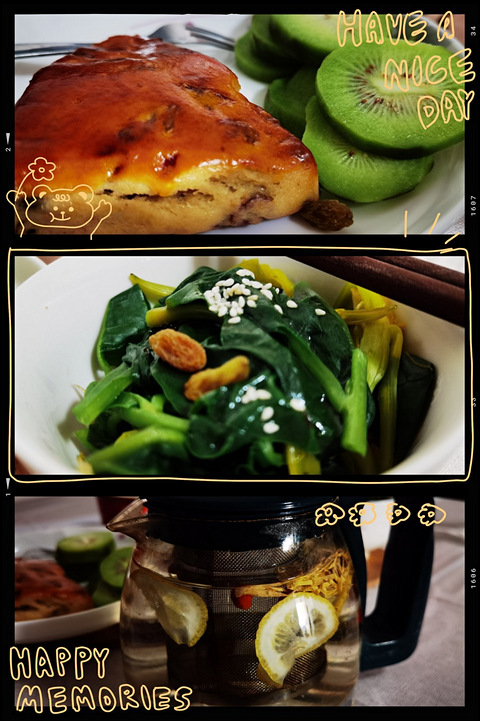 鲍师傅家的司康,不要问我为什么去鲍师傅家买司康,就是个人喜欢司康[ej=1F604]白灼蔬菜,煮的时候加少许盐,捞出来后加麻油、芝麻、葡萄干柠檬菊花茶,加了几颗枸杞。这一天的茶饮安排好了。 开心快乐的周末来首音乐 薅一本最近爱不释手的书别管做作业的小学生啦,人家自己会[ej=1F60B][ej=1F618]