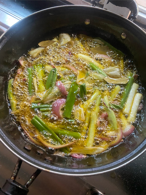 香叶、洋葱、大葱,下锅炸至金黄后清出锅。继续加热油锅,依次放入花椒、蒜泥、姜粒,约等一分钟后放入辣椒(辣椒要去湿后冲融),在加入香菇丁、花生粒、白芝麻、胡椒、花椒面、盐、味精、鸡精、孜然粉、花椒油。等香味扑鼻(大约5分钟左右),关火冷下后就可以装瓶了。