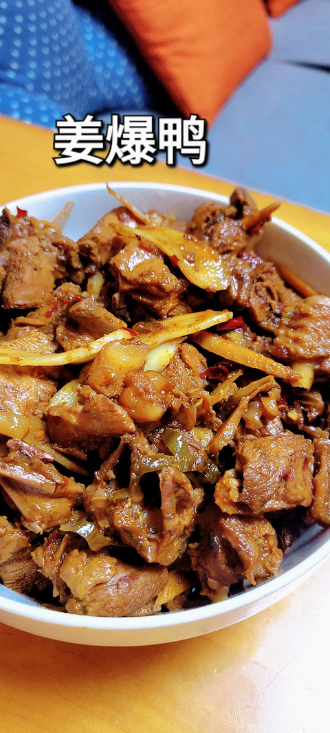 一、备菜。嫩鸭半只、鲜嫩姜半斤、啤酒、洋葱(我喜欢吃洋葱就买的一个,不喜欢也可以不要,用白糖代替)、泡姜、泡辣椒、蒜瓣、花椒、豆瓣。1. 清洗嫩鸭,嫩鸭比较肥,在清洗过程中可以把鸭油撕下来,单独装在小碗里。2. 鲜嫩姜切片。较老的姜片和较嫩的姜片分别盛放在两个碗里(分量可以是对半分;也可以较老的占三分之一,较嫩的占三分之二,因为较老的是用来最开始炒料的,较嫩的是鸭肉熟透之后最后放来增香提味而且可以