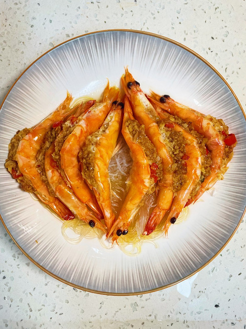 虾的做法有很多,今天做一下蒜蓉口的,简单好吃又营养噢~~蒜蓉真的可以跟所有海鲜搭~—————— ??????? —————『蒜蓉粉丝虾』食材虾、大蒜?、蚝油?、粉丝 1.虾挑出虾线,用剪刀剪去多余的虾须和虾脚并开背清洗干净备用; 2.碗里加入适量开水把粉丝泡软; 3.大蒜搅成蒜末备用,锅里加入适量底油,先放一部分蒜蓉小火煎得金黄,再加入剩余蒜蓉、小米辣,炒香后根据个人口味加入