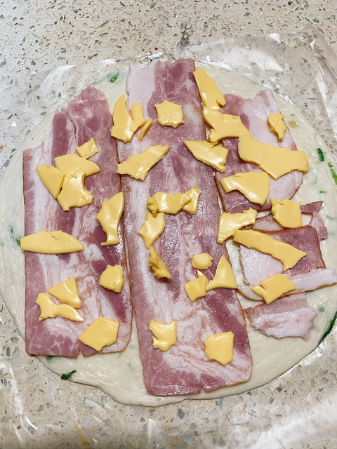 培根芝士卷你们一定要试试!太香太香太香了手抓饼铺培根和芝士,撒点黑胡椒,卷起来切段,刷蛋黄液撒芝麻,烤箱190度18分钟OK!真的又酥又香,太好吃了!
