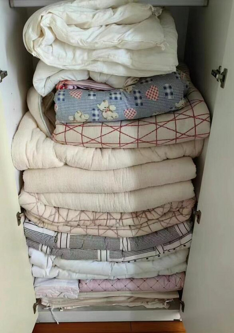 不知道别人家里是不是这个情况,我们家里真的太多铺盖了,这只是一小部分,还有嫩个一柜子。但是现在冬天都不怎么冷,一个房间有一床厚的,一床薄的就够了。多出来的简直不知道怎么办,特别是一些棉絮,感觉太重了,已经两年没拿出来盖,可是又不能扔你们家里不用的铺盖都怎么办,是不是也是铺盖很多啊?