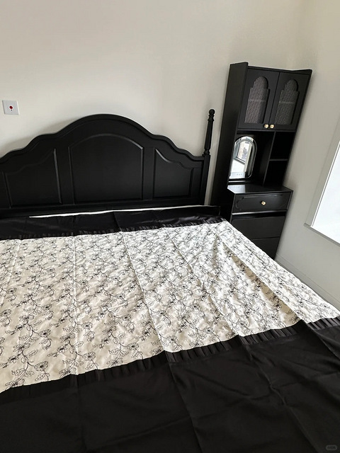 我家就是同款黑色实木床,刚好刷到了这个姐妹,瞬间给我整了点阴影出来,我现在看我家的床都不顺眼了。美式复古风招谁惹谁了?黑色床是不是不能配黑色四件套,这姐妹还给搭了同色梳妆台,看起来真瘆人...